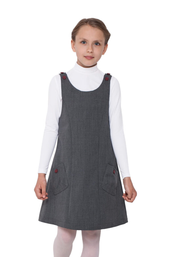 Lengvai platėjantis sarafanas su kontrastinės spalvos sagomis atrodo tvarkingai bei žaismingai. Užsegamose kišenėse saugu laikyti svarbius daiktus.Papildomų sagų ant petnešėlių pagalba lengvai pailginsite/patrumpinsite sarafaną.